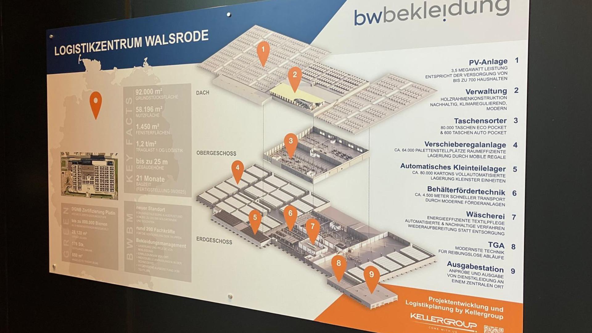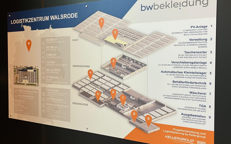 Auf dem rund 100.000 Quadratmeter großen Gelände im A27park Walsrode wird die Bundeswehr-Bekleidungsmanagement GmbH von nun all das kommissionieren und lagern, was die Soldatinnen und Soldaten der Bundeswehr an persönlicher Bekleidung und Ausrüstung für ihre Einsätze benötigen – und zwar in einem zirka 58.000 Quadratmeter großen Gebäudekomplex auf drei Etagen, einschließlich Hochregallager, AKL, Blocklager, Wäscherei und Werkstattbereich sowie eines attraktiven Bürotrakts auf der Dachebene. Das Gebäude ist nach höchsten Nachhaltigkeitsstandards errichtet, DGNB-Platin zertifiziert und verfügt über mehr als 3 MW Photovoltaik auf dem Dach.